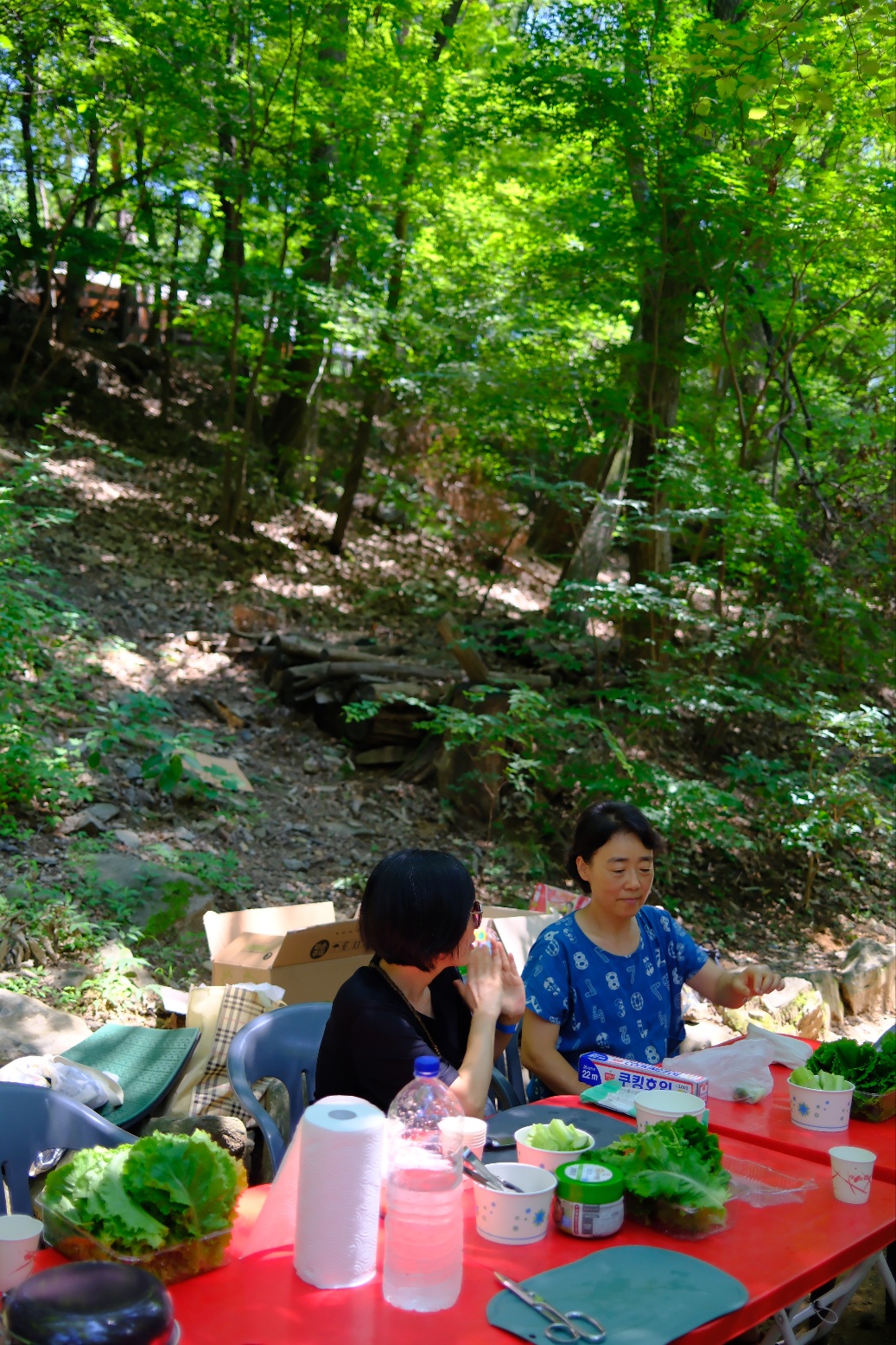 캠프는 시원한 계곡에서의 바비큐와 물놀이로 시작했습니다.