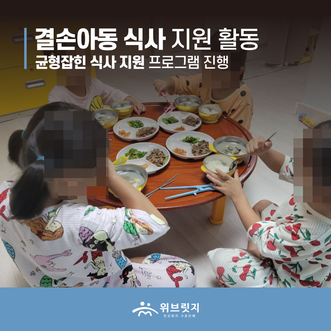 아동지원단체 위브릿지는 결손아동 대상으로 건강하게 성장할 수 있도록 식사지원사업을 운영 중에 있으며 든든한 식사를 지원하여 아이들의 성장에 도움이 될 수 있도록 영양가 가득한 식사를 선물하고 있습니다.