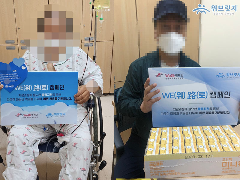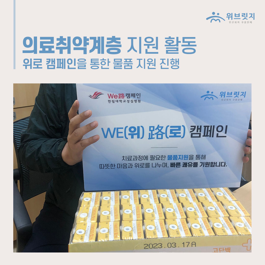 빈곤퇴치구호단체 위브릿지는 의료취약계층에게 치료 과정에서 필요한 의료물품 및 교통비를 지원하는 "위로캠페인"을 진행하였습니다.
