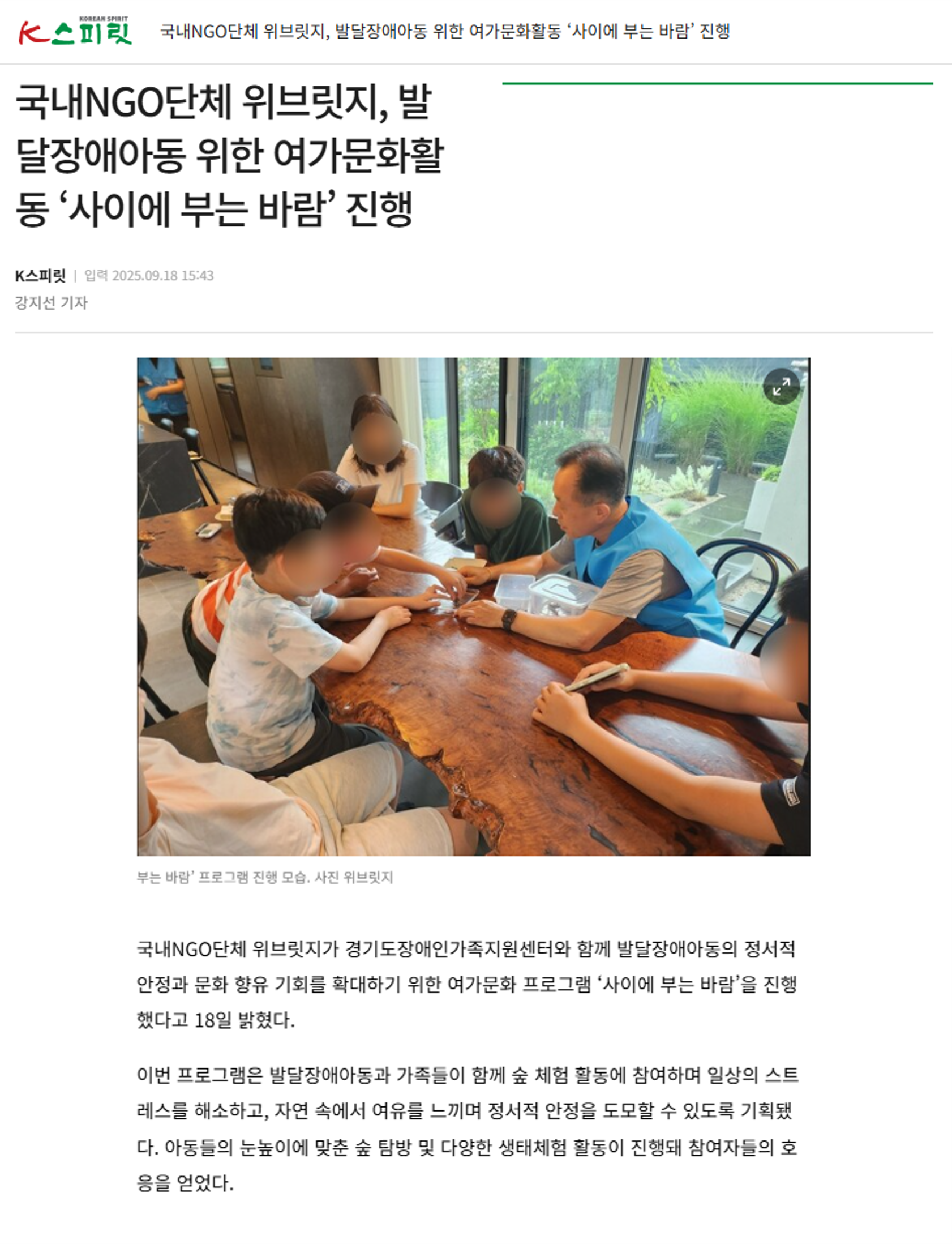 국내NGO단체 위브릿지가 경기도장애인가족지원센터와 함께 발달장애아동의 정서적 안정과 문화 향유 기회를 확대하기 위한 여가문화 프로그램 ‘사이에 부는 바람’을 진행했다고 18일 밝혔다.